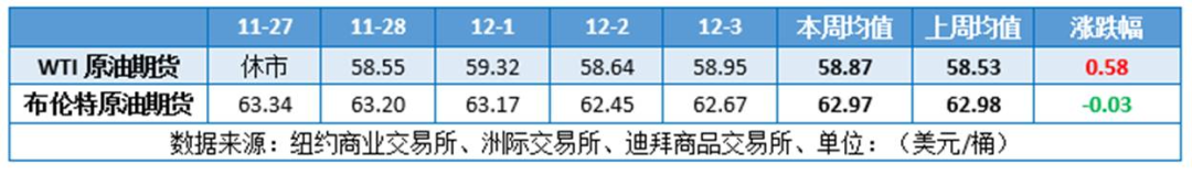 导言:本周(11.27-12.3),国际原油价格整体呈现区间震荡的走势,周度均价环比涨跌不一。WTI均价58.87美元/桶,较前一周上涨0.34美元/桶,或0.58%。周内,对油价起到支撑的因素有:OPEC+维持暂停增产政策以及美俄高层会晤没有达成协议。导致油价承压的因素有:投资对俄乌局势持观望态度以及美国原油库存减少。
