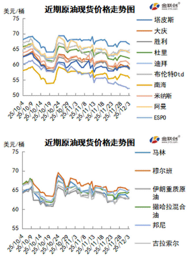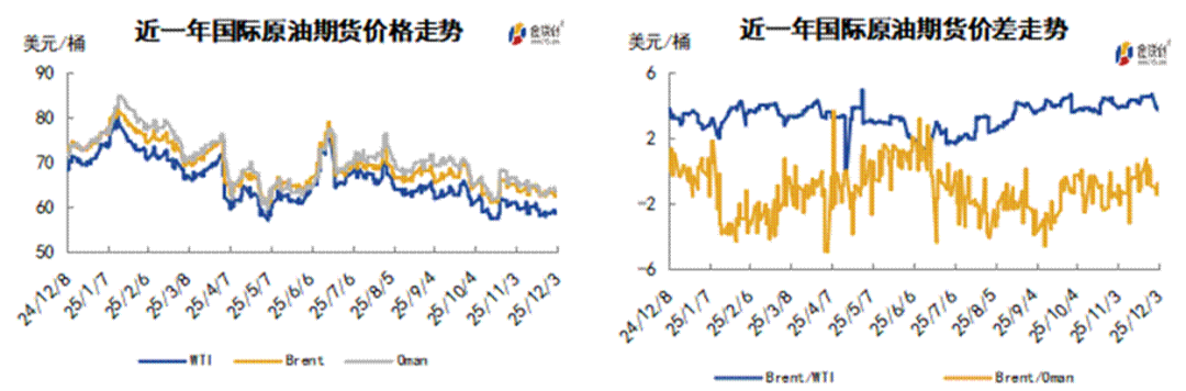 本周(11.27-12.3),原油整体呈现区间震荡的走势,周度均价环比涨跌不一。周内,供应方面,OPEC+8国保持暂停增产政策对油价起到支撑作用,石油输出国组织(OPEC)发表声明,OPEC+8个主要产油国决定,维持11月初制定的产量计划,在2026年一季度暂停增产。地缘局势方面,俄罗斯原油因不可抗力供应减少的预期利好油价,位于新罗西斯克的里海管道集团公司系泊设施29日遭无人艇袭击,导致装船和其他生产作业暂停,油轮紧急撤离。此外,乌克兰消息人士透露,俄罗斯“友谊”输油管道塔甘罗格至利佩茨克段因袭击发生爆炸。除俄乌局势外,委内瑞拉地缘局势紧张也对油价起到支撑作用。美国总统特朗普在社交媒体发文称,委内瑞拉上空及周边空域“被视为全面关闭”。此后,委内瑞拉就特朗普的言论向国际民用航空组织提出申诉,指控美方“侵犯主权”。